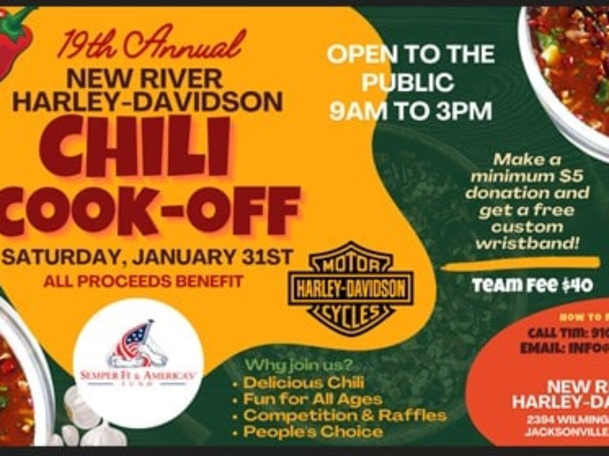 This event has passed.Find Another Event Events 19th Annual New River Harley-Davidson Chili Cook Off January 31, 2026 Date January 31, 2026 9:00am-3:00pm CST Registration New River Harley-Davidson, 2394 Wilmington Hwy, Jacksonville, North Carolina 28540 Join us for for the 19th Annual Chili Cook-Off benefiting Semper Fi & America’s Fund! Bring your friends, bring your family, and bring your appetite! Competing teams will battle for ultimate bragging rights! Awards: Prizes for Judges’ 1st, 2nd, and 3rd place, plus the coveted People’s Choice Award! Entertainment: A Band, awesome Raffles, and more! Motorcycle Demos: Take a new Harley for a spin! Refreshments: Enjoy Beer, Coffee, & Lemonade to wash it all down. Food Trucks: A variety of food trucks will be on site. Event Schedule: 7:00 AM: Team Setup Begins 11:00 AM: Chili Tasting Starts! 2:00 PM: Awards Ceremony Parking is by donation to support the Semper Fi & America’s Fund. Make a minimum $5 donation and get a free custom wristband! Volunteer opportunities are available at this event. Contact Tanya Washington, Volunteer Director, at tanya.washington@thefund.org to get involved.