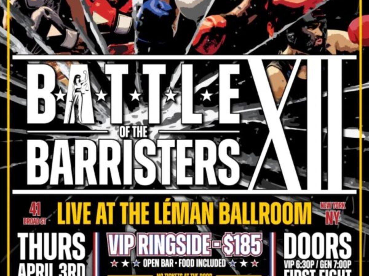 Join us for the annual Battle of the Barristers where prosecutors, paralegals, and staff from the Manhattan District Attorney’s Office and the Centre Street legal community will step into the ring at Léman Ballroom in Manhattan to fight for veterans and kids in need of a safer after-school environment.