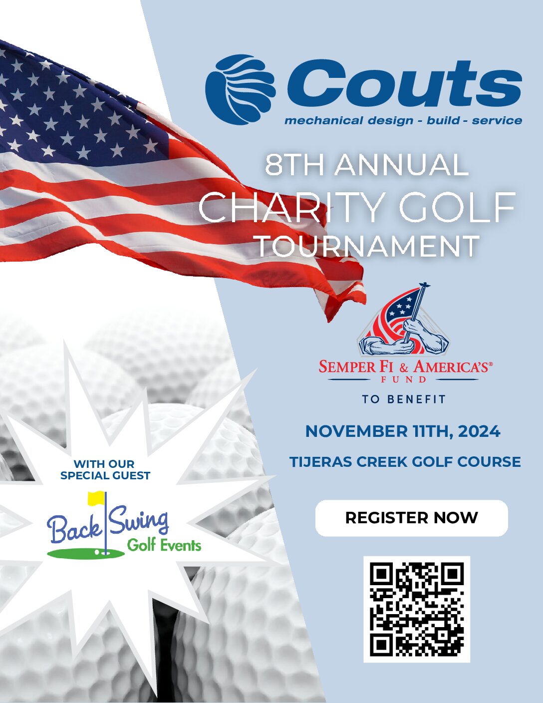 Couts Heating & Cooling will be hosting their 8th Annual Charity Golf Tournament on November 11th in support of Semper Fi & America’s Fund. If you are interested in registering or sponsoring this event, please scan the QR code on the flyer.