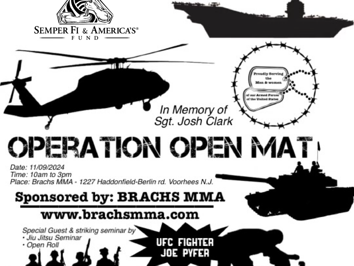This event has passed.Find Another Event Events Operation Open Mat 2024 November 9, 2024 Date November 9, 2024 Operation Open Mat Location: Brachs MMA – 1227 Haddonfield-Berlin Rd. Vorhees, NJ Date: November 9, 2024 Time: 10 AM – 3 PM Brachs MMA will be hosting an Operation Open Mat event in memory of Sgt. Josh Clark. There will be a special guest and striking seminar by UFC fighter Joe Pyfer, Jiu Jitsu seminar, and open roll. For more information, check out their website at https://www.brachsmma.com/ or their Facebook HERE. Thank you to Brach’s MMA for your unwavering commitment to our mission and the heroes we serve.
