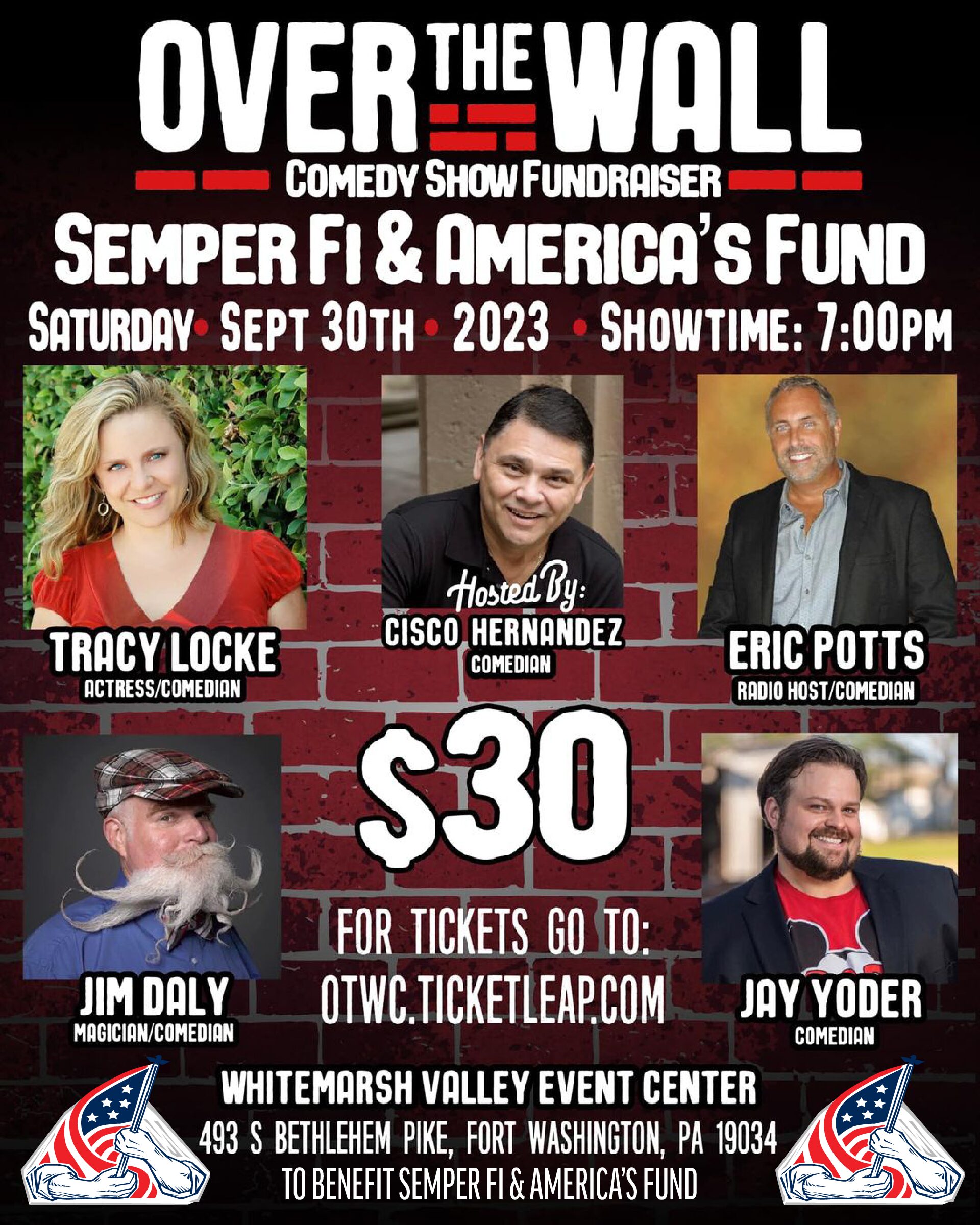 This event has passed.Find Another Event Events Over the Wall Comedy Show Fundraiser September 30, 2023 Date September 30, 2023 Over the Wall Comedy Show Fundraiser to benefit Semper Fi & America’s Fund Date: Sept 30, 2023, 7 PM Show Time: Doors open at 6:00 PM, showtime is 7:00 PM. More Information and tickets: https://otwc.ticketleap.com/093023/