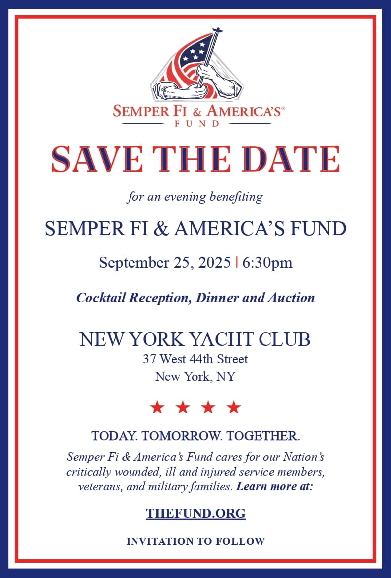 Join us for an unforgettable evening in support of our nation’s heroes at the historic New York Yacht Club. This exclusive event will feature a cocktail hour, a three-course dinner, and the auctioning of once-in-a-lifetime experiences—all to raise critical funds and awareness for Semper Fi & America’s Fund.